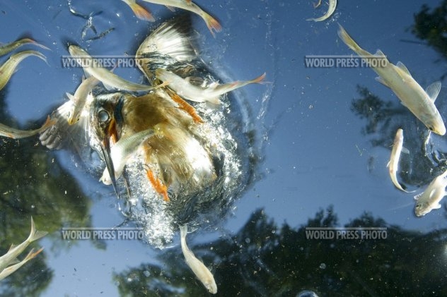 Közismert, hogy az ilyen képek úgy készülnek, hogy a fotós nagy levegőt vesz, lemerül a tó fenekére, aztán ott a hátára fordul, és a fényképezőgépével várja, hogy egy csapat küsz beússzon elé, majd aztán nyilván lecsap rájuk a jégmadár, és akkor kell megnyomni a gombot. Melós, de megéri! Nos, nem egészen így van. A halakat egy lavorba rakják, aminek az aljára szerelik a fényképezőgépet, és az egészet elhelyezik az alatt a fa alatt, ahol a jégmadár szokott ücsörögni. Aztán tisztes távolból reménykedni kell abban, hogy a jégmadár tényleg a lavórban úszkáló halak közé csapjon, és a távkioldóval elsütött gép a legjobb pillanatban exponáljon. Ennyi.