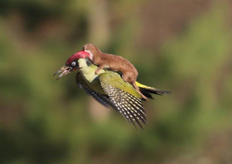 A hét másik fotós szenzációját a harkály hátán repülő menyétet vizsgálva is elindulhat a konteo logika. Vajon mikor derül ki Martin-Le-May fotójáról, hogy a harkályt Pokolgépnek, a menyétet pedig Piramisnak hívják és gyerekkoruk óta együtt repkednek?