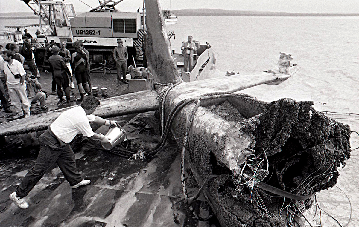 Pedig minden egyben volt! A szervezők biztosítottak egy külön hajót a sajtónak, amivel megközelítették a kiemelő darut, és kiválóan fényképezhető volt az egész művelet, amint a cumó egy drótkötélen lógva repked a levegőben gépestül, szárnyastul, búvárostul. Na, ezzel, meg is vagyunk, irány a part. Igen ám, de a hajón állófogadás kezdődött, kaja-pia, bájcsevej, amire sem időm, sem érkezésem nem volt. Így aztán két kollégával együtt rádumáltunk egy vízirendőrt, hogy ugyan legyen már oly kedves és vigyen ki minket a partra. Arra nem számított, hogy közben filmeskupakokkal fogok rá lövöldözni… A többit már leírtam.