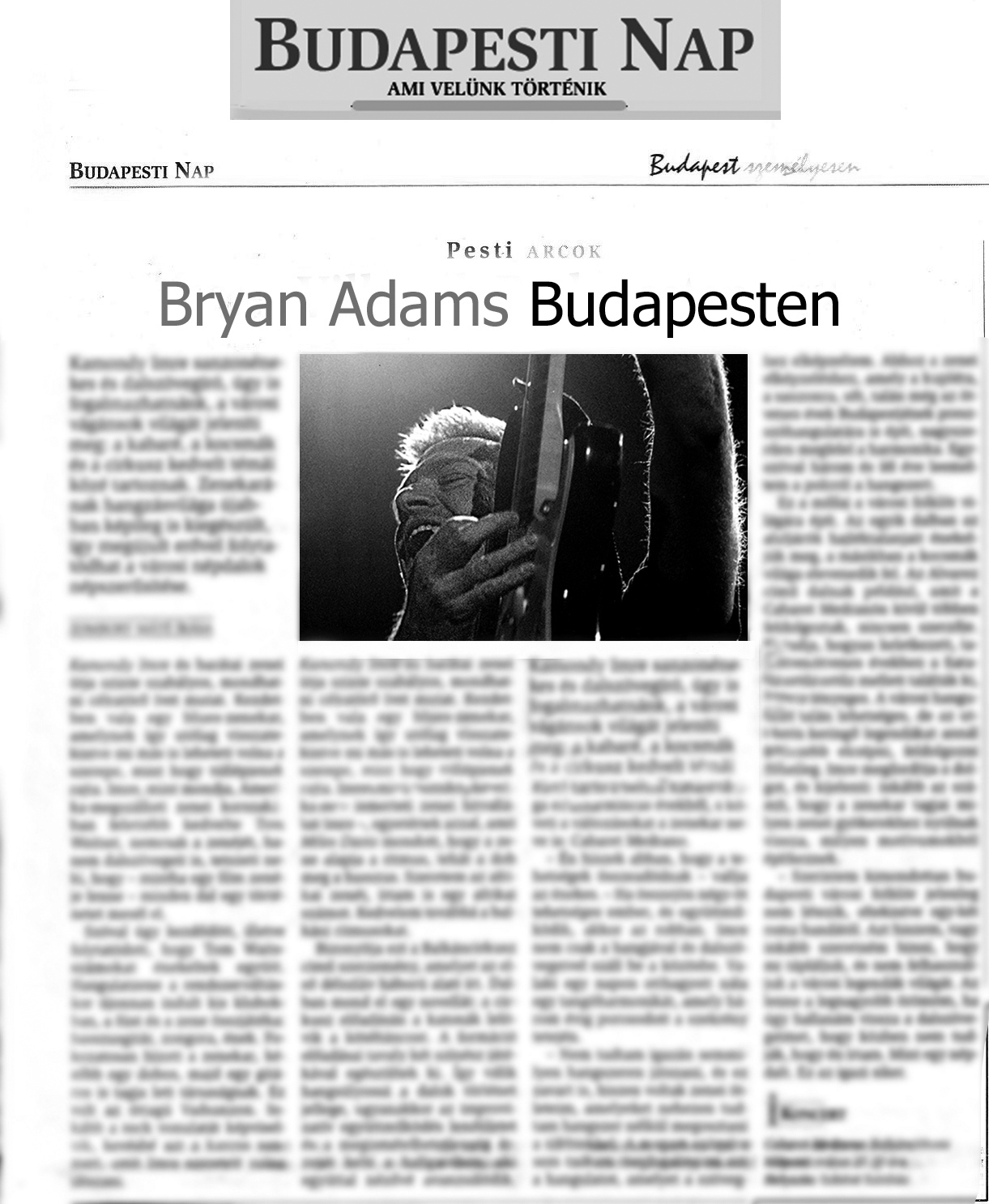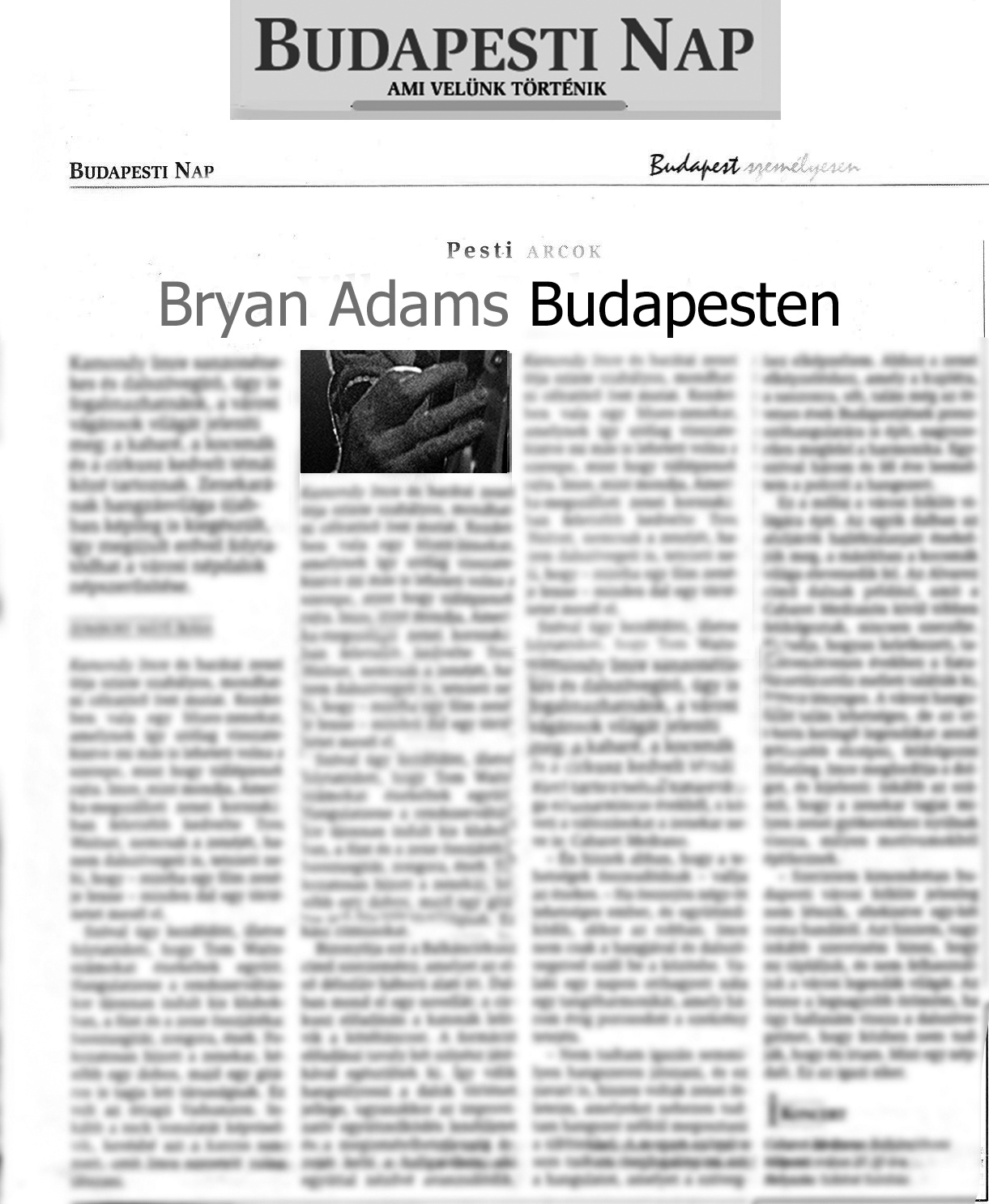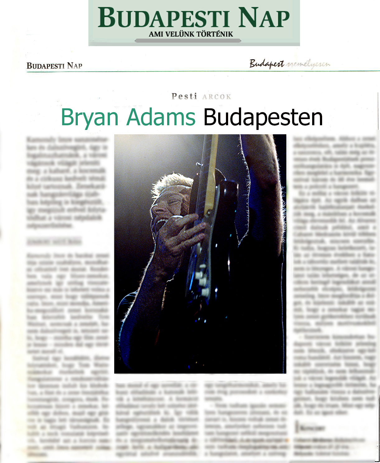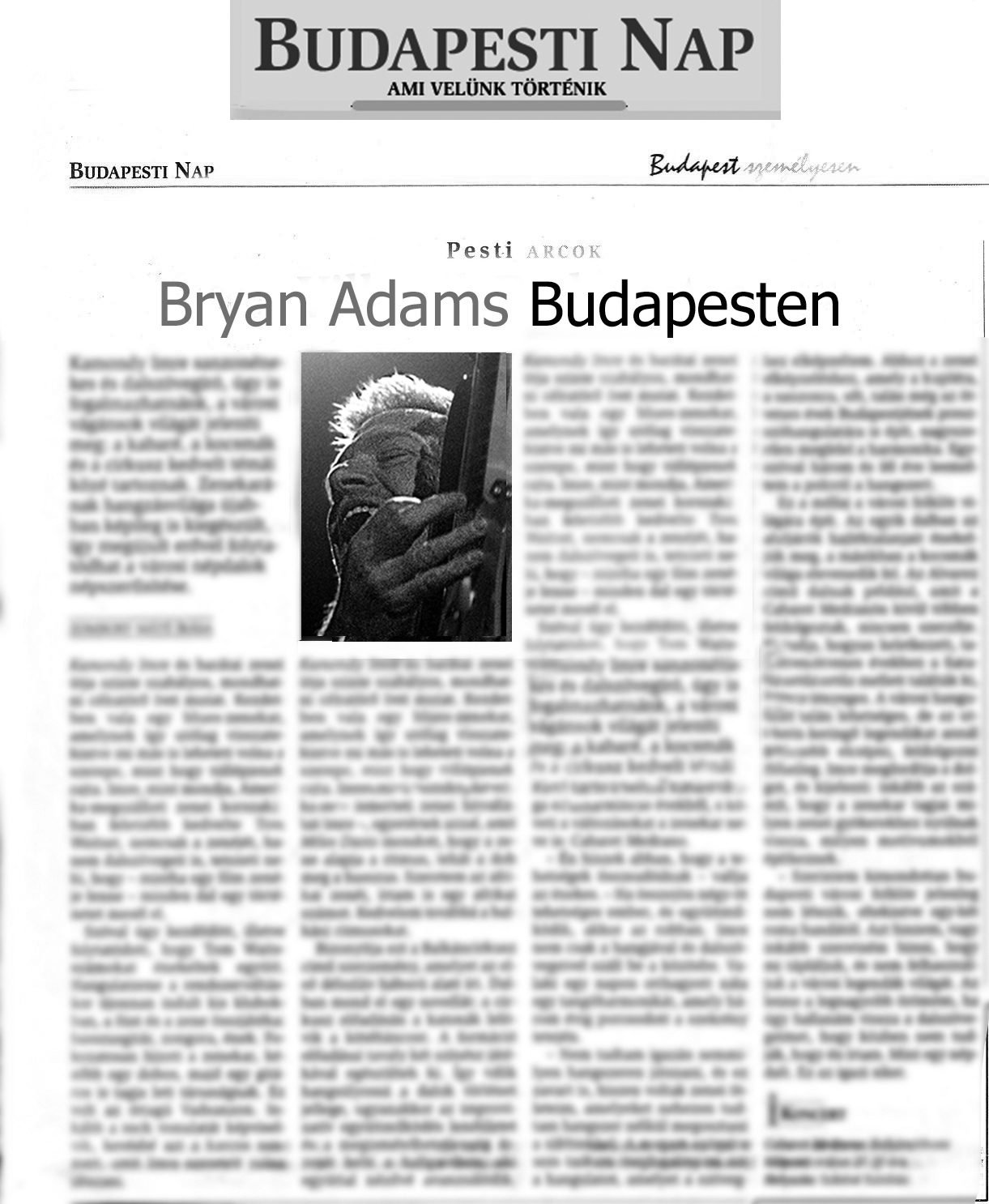 2003 áprilisában volt egy Bryan Adams koncert Budapesten. Bár én ritkán fényképeztem a lapba, inkább szerkesztettem, de ez esetben kivételt tettem, és magam készítettem el a kurvajó koncertfotókat. Másnap délelőtt a magát kulturális rovatvezetőnek képzelő hölgy berajzolta az oldaltervet, ahol két hasábos állóra tervezte a Bryan Adams képet. Ok, kerestem egy képet és betördeltük az oldalt, ami akkor kb így nézett ki (nagyításhoz kattints a képre) :