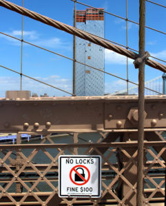 A napokban olvastam, hogy két Párizsban élő amerikai még petíciót is indított a lakatok ellen, amit több ezren írtak alá. Hogy miért pont amerikaiak támadták be a párizsi lakatokat, arra a minap jöttem rá, amikor is átsétáltam a New York-i Brooklyn hídon. A szerelmesek kedvenc amerikai zarándokhelyén ugyanis, tanulva a francia példából, a hülye amerikaiak kiraktak néhány táblát, amin 100 dolláros büntivel fenyegetik meg a magukról megfeledkezett lakatolókat. Ez persze nem tántorít vissza mindenkit, és bár a híd végig be van kamerázva, a rutinosabb szerelmesek két szelfi között csak felcsempésznek néhány zárszerkentyűt a híd eldugottabb részeire. (fél órája gondolkodom, hogy van-e a lakatnak magyar szinonimája, de nem jutott eszembe semmi, a „zárszerkentyűt” meg jobb híján most találtam ki)