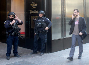 Ez a Trump Tower pont olyan ízléstelen és röhejes most is, mint három évvel ezelőtt, leszámítva, hogy a tulaj akkor még nem volt elnök. De ha meg már így alakult, és elnök lett, akkor gyorsan kirendelték az amerikai TEK-et, hogy ugyan védjék már meg az épületet az esetleges támadásoktól. Aztán, hogy ezek pontosan milyen típusúak és honnan jönnek, az kb mindegy is, mert úgy sem lesz ilyen, de az elnök úr addig is felhívja a New York-iak figyelmét saját fontosságára, nehogy véletlenül elfelejtsék! Pedig ezen dolgoznak azért ezerrel: igyekeznek pont le se szarni a tornyot, a rendőröket, meg persze Trumpot. Aki eredetileg nem is akart innen elköltözni elnökként, de aztán felhívták a figyelmét néhány nemzetbiztonsági szempontra, így végül meghátrált. (Eddig egyébként egész elnökségét ez a struktúra jellemzi.)