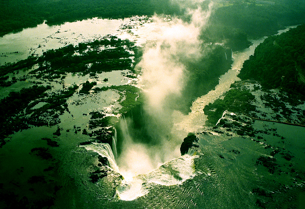 Mivel a másik fotós, egy csaj volt, ezért hölgy létére ő szállt be elsőként, ezt tudtam, hogy sima lesz, de a neheze most jött. A japán turista rendkívül udvarias, mindenkit maga elé enged, ezt próbálta velem is, de akkor én ülök középen 250 dollárért… Hirtelen ötlettel megkértem, hogy segítsen nekem becuccolni, és hát, egy japán turista nem utasíthatja vissza a segítségkérést. Beült a masinába, én meg kintről beemeltem neki a táskámat, aztán gyorsan én is beültem a helikopterbe, behúztam az ajtót és ráüvöltöttem a pilótára: Ok, let’s go! Felszállás után az ablakot lehúztam, és hát, a kép alapján mindenki döntse el, hogy megérte-e ez az egész tortúra?! A képen azt a pontot, ahol a víz bezúdul a kanyonba, a helyiek portugálul úgy hívják, hogy „Garganta do Diabo” – Az ördög torka…. Jut eszembe, fotózás közben végig olyan érzésem volt, mintha valaki folyamatosan a vállamat meg a tarkómat lökdösné egy fényképezőgéppel…