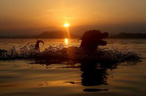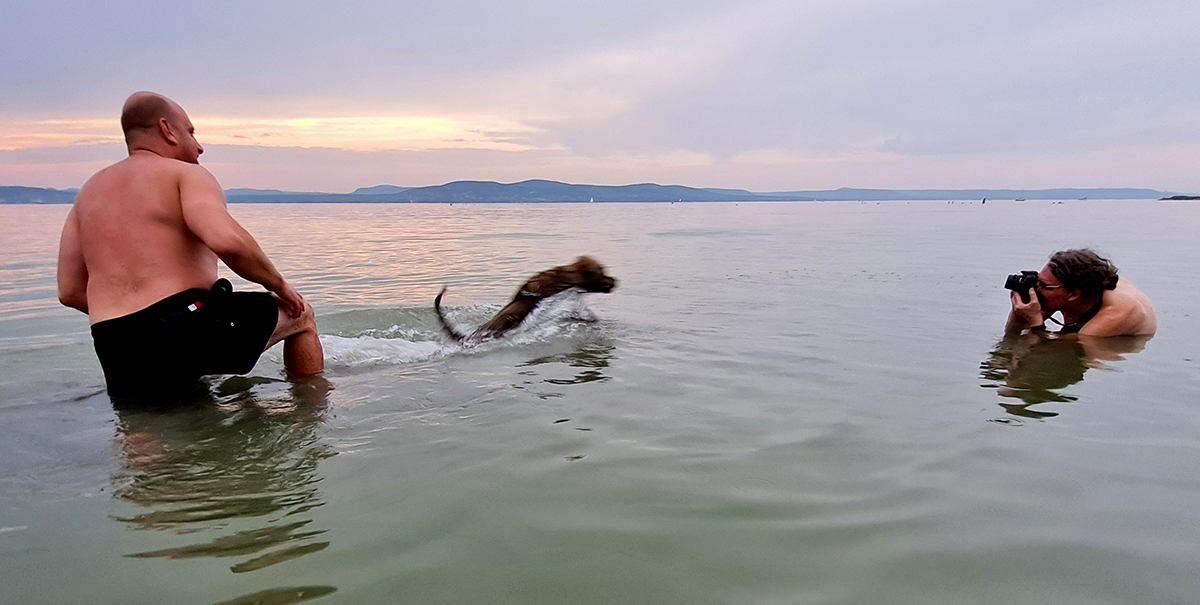Természetesen szó sincs mázliról és véletlenről. Ez az egész jelenet pontos dramaturgia mentén lett megtervezve és kivitelezve, és mivel az időjárás erősen tréfás kedvében volt, ezért nem is sikerült egy nap alatt megcsinálni a képet, így másnap pótforgatást is tartottunk. Ha az ember kitalál egy ilyen képet, akkor mindenképpen kell hozzá egy olyan kutya, amelyik, ha nem is makulátlan neveltetésű, de nagyjából végrehajt bizonyos utasításokat, amik mentén oda lehet pakolni a háttérvilágítás elé. Engedjétek meg, hogy bemutassam Royt, aki leginkább azért tűnt alkalmasnak a feladatra, mert nem irtózott a víztől, sőt! Néha alig lehetett kikönyörögni belőle. Ez persze még nem jelenti azt, hogy Roy cimborális felkérésre egy meghatározott sávban fog szaladgálni előttem a vízben, de kedvenc labdájának dobálásával el lehetett érni, hogy nagyon sokadikra azt tegye, amit szerettem volna.