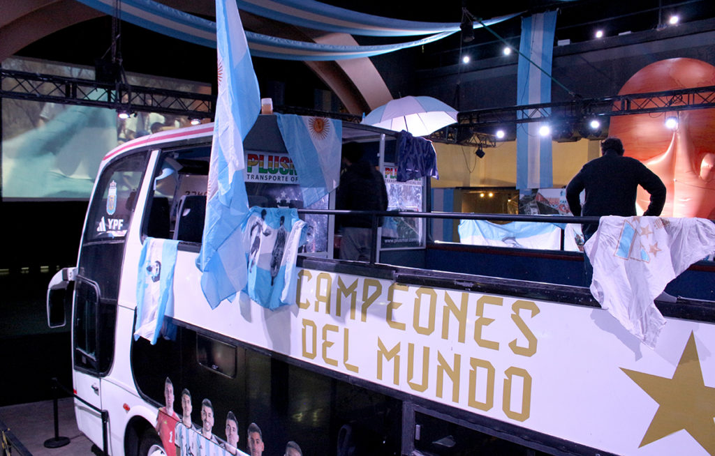 Az egyik teremben egy 360 fokos moziba ülhetünk be, ahol nonstop tolják a 2022-es foci vébé döntőjét. Az utána következő csarnokba pedig beállították azt a buszt, amelyikkel a csapat a tavaly decemberi vébégyőzelem után végigment a reptértől a belvárosig. Igen, az egész emeletes busz az eredeti dekorációval és zászlókkal bent áll egy hangárban a múzeumban. Fel is lehet rá menni. Ja, és persze ki van állítva az eredeti világkupa is, amit most címvédőként az argentin szövetség őriz négy évig.