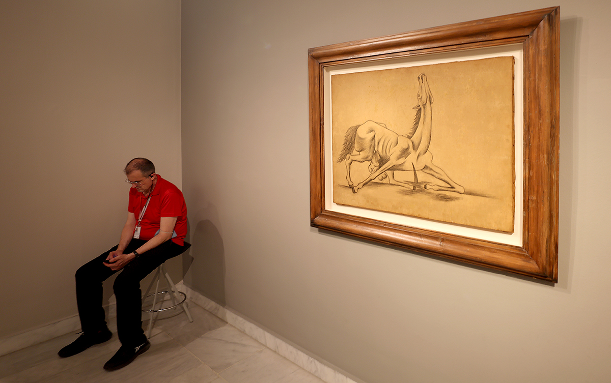 Ez a kép Barcelonában készült a Picasso múzeumban, és a mester 1917-ben készült, A kibelezett ló című képét ábrázolja egy meglehetősen enervált teremőr társaságában. Ez a forma már annyira unja Picassót, hogy inkább a telefonja társaságát keresi. Vagy valaki másét a telefonon keresztül, de ez amúgy tökmindegy.
