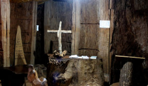 Az Aripuca emlékhely egy 17 méter magas, 30 méter átmérőjű 500 000 kiló össztömegű, fatörzsekből álló, hatalmas szerkezet. Megépítéséhez nem kivágott fákat, hanem az erdő kidőlt fatörzseit használták. Az emlékmű összesen 28 őshonos fafajból épült, és minden egyes fatörzsbe bele van karcolva az adott fa neve és elterjedési területe. A fatörzsek közt bolyongva észrevettem egy „capilla” feliratú táblát, ami ugye magyarul kápolnát jelent, és a nyilakat követve a képen látható oltárhoz érkeztem. Merthogy ez egy templom oltára, még ha elsőre nem is tűnik annak.