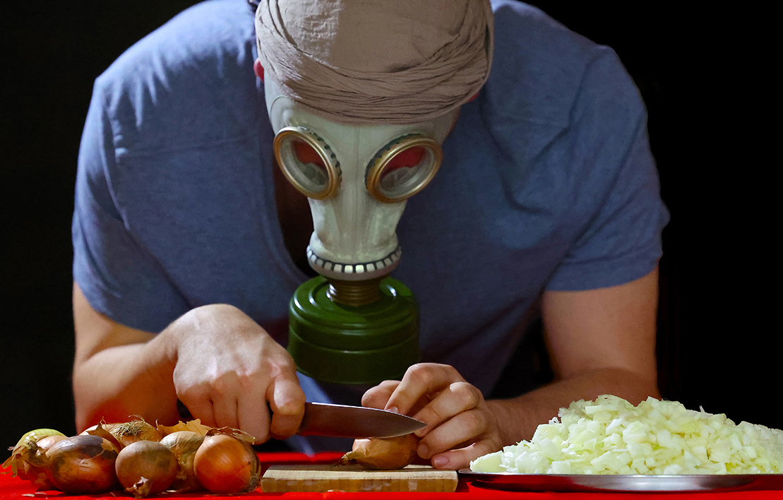 A cél az volt, hogy ha valaki ránéz erre a képre, akkor egyrészt azonnal eszébe jusson a hagyma illata, másrészt az összes ezzel kapcsolatos kellemetlen élmény. Ráadásul egyáltalán nem volt egyszerű ezt összehozni. Már az problémát okozott, hogy biztos voltam abban, hogy ezt az egészet már korábban kitalálták. Mármint hogy gázálarcban vágjon valaki hagymát. Aztán hosszas keresgélés után arra jöttem rá, hogy nem. Ezt így nem fényképezte le senki. Zárójelben említem, hogy ha valaki talál egy portugál vagy litván nyelvű oldalon egy ilyen képet, akkor az nem ér!